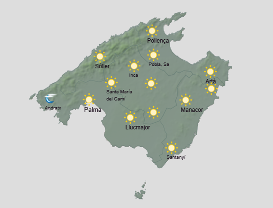Segons l’AEMET, hi haurà cel poc ennuvolat amb intervals de núvols alts augmentant al capvespre a cel cobert, amb algun ruixat ocasional a la nit. Temperatures amb pocs canvis o en descens les nocturnes. Vent moderat amb algun interval de fort de l’oest i nord-oest girant al capvespre a sud-oest.
