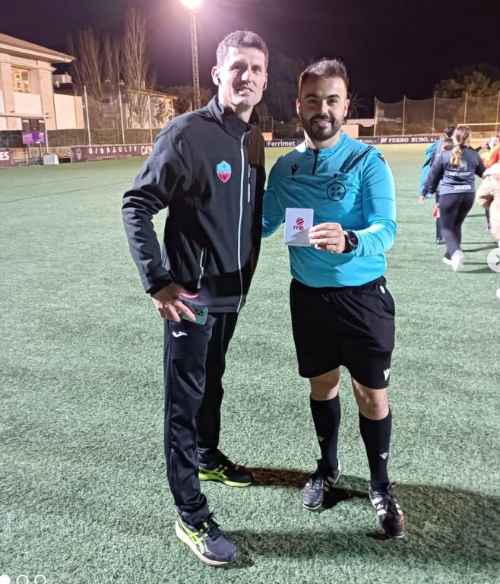 L’entrenador David Carsi i i l’àrbitre del partit amb la targeta blanca
