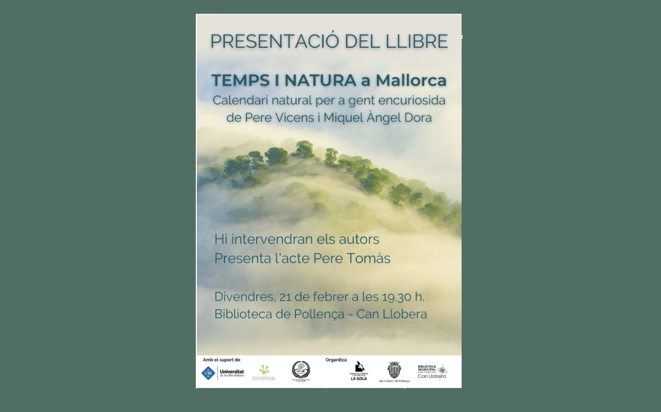 El divendres 21 de febrer, a les 19’30 hores, a Can Llobera, es farà la presentació del llibre Temps i natura a Mallorca. Calendari natural per a gent encuriosida de Miquel Àngel Dora i Pere Vicens Siquier. En aquest acte, el pollencí Pere Tomàs acompanyarà els autors del llibre.