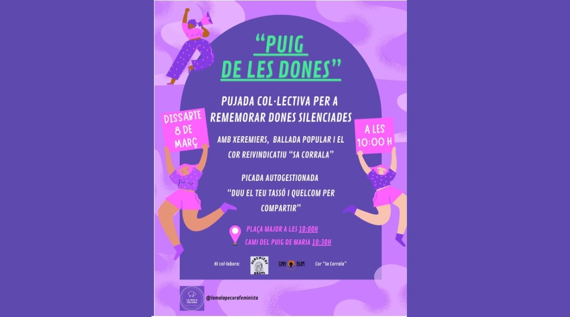 La Mala Pècora organitza la 3a. edició d’El Puig de les dones, una caminada col·lectiva i reinvidicativa que aquest 2025 coincideix amb el Dia Internacional de la Dona (8 de març) i que presenta algunes novetats com un sortida des de la plaça Major i acompanyament musical.