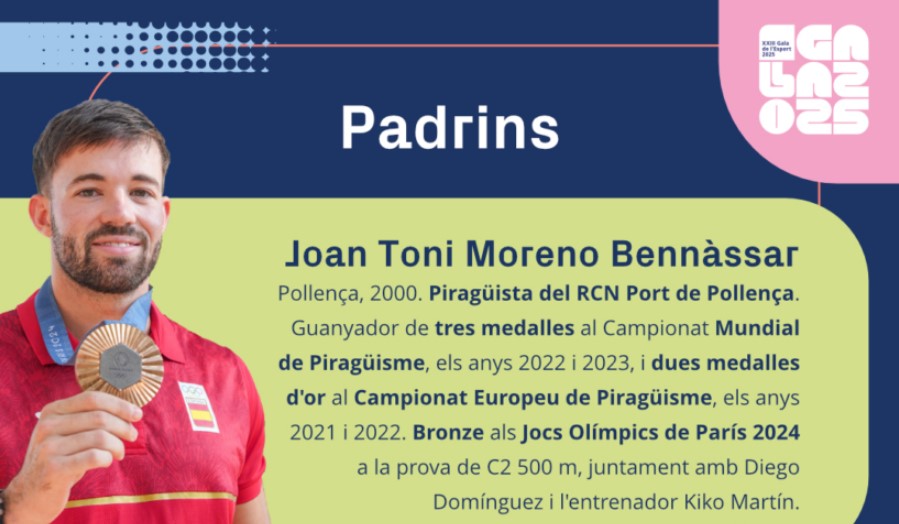 Als Jocs Olímpics de París 2024, el pollencí Joan Toni Moreno Bennàssar va aconseguir una medalla de bronze a la prova C2 500 metres, juntament amb Diego Domínguez, i aquest 2025 serà un dels padrins de la Gala de l’Esport del Consell de Mallorca juntament amb la pilot de ral·li, Sonia Ledesma. Anys després es recupera aquesta figura dels padrins, com a exemple per als joves.
