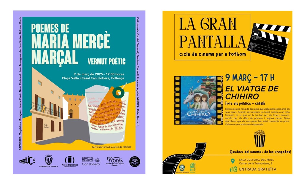 Aquest diumenge 9 de març, l’activitat social i cultural al municipipassa per a un Vermut Poètic entre Can Llobera i la plaça Vella de Pollença i la projecció del film El viaje de Chihiro al Saló Cultural del Port de Pollença.