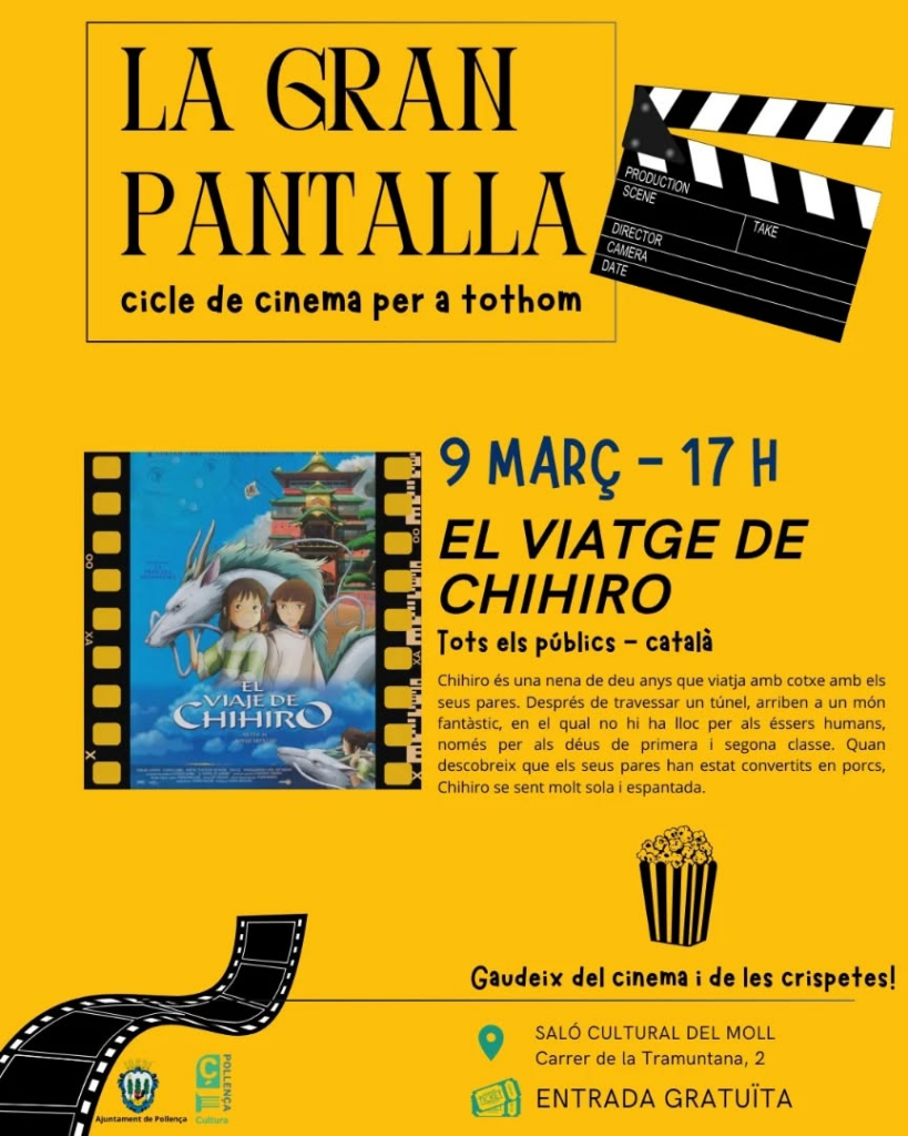 I, a les 17 hores, al Saló Cultural del Port de Pollença (carrer Tramuntanea, 3), es projectarà el film d’animació El viaje de Chihiro, la segona pel·lícula del cicle de cinc que formen “La gran pantalla” i que s’allargarà fins al mes de maig.