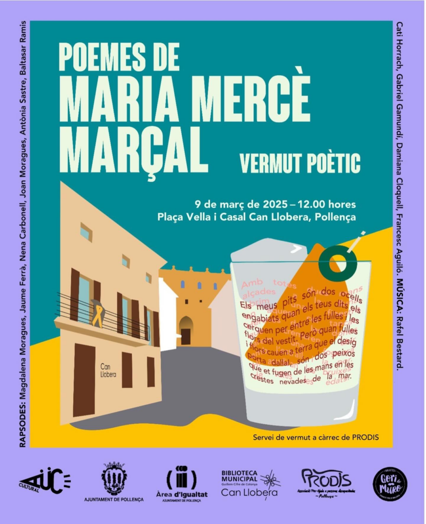 Dins el marc de la programació del mes de la dona, hi haurà un Vermut Poètic en homenatge a l’escriptora i activitats Maria Mercè Marçal. A les 12 hores, a Can Llobera, Aüc Cultural oferirà un lectura dramatitzada de poemes de Maria Mercè Marçal i, en acabar, hi haurà vermutada a càrrec de Prodis amb la col·laboració de Galletes Gori.