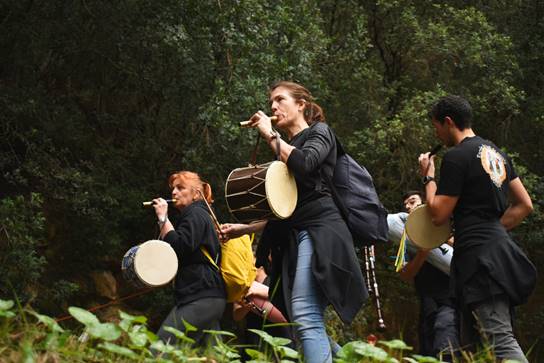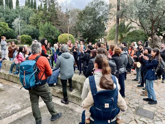 A les 10:30h es va arribar a l’inici del camí d’El Puig, on s’hi concentraven més participants que es varen voler sumar a la iniciativa. Ja enfilant la muntanya, la següent aturada va estar dedicada a les dones artistes, denunciant la poca representació femenina al currículum escolar actual d’Història de l’Art. En aquesta aturada va haver un primera actuació musical de Sa Corrala, un cor veïnal de Palma que s’ha creat fa poc més d’un any, i que va aconseguir que tothom s’animés a cantar, acompanyant-les.