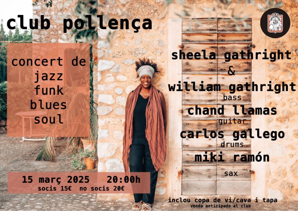 A les 20 hores, al Club Pollença, hi haurà un concert a càrrec de la cantant novaiorquesa Sheela Gathright acompanyada pel seu germà, el baixista William Gathrignt, però també pel guitarrista Chand Llamas, els percussionista Carlos Gallego i el saxofonista Miki Ramon.