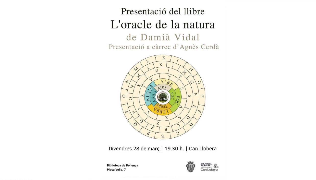 L’escriptor pollencí Damià Vidal presenta el poemari L’oracle de la natura (Documenta Balear, 2024) a Can Llobera el proper divendres 28 de març, a les 19’30 hores i ho fa acompanyat de la filòloga Agnès Cerdà.