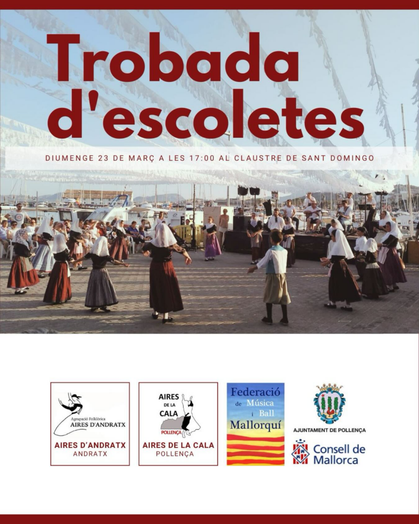 I, després d’una matinal de circ, a les 17 hores, al Claustre de Sant Domingo de Pollença, hi haurà Trobada d’Escoletes, una trobada que reunirà escoles de ball de pagès de diferents indrets de Mallorca entre les quals els petits d’Aires de la Cala de Pollença.