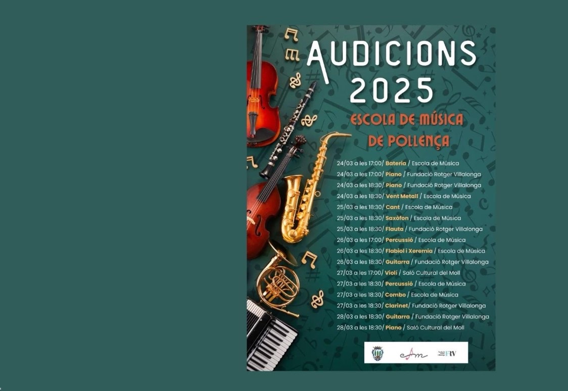 Durant el segon trimestre del curs, els alumnes de l’Escola de Música fan les audicions d’especialitat. Aquesta vegada, les Audicions es faran en tres escenaris diferent: l’Escola de Música i el Saló d’Actes de la Fundació Rotger Villalonga, a Pollença, i al Saló Cultural del Port de Pollença.