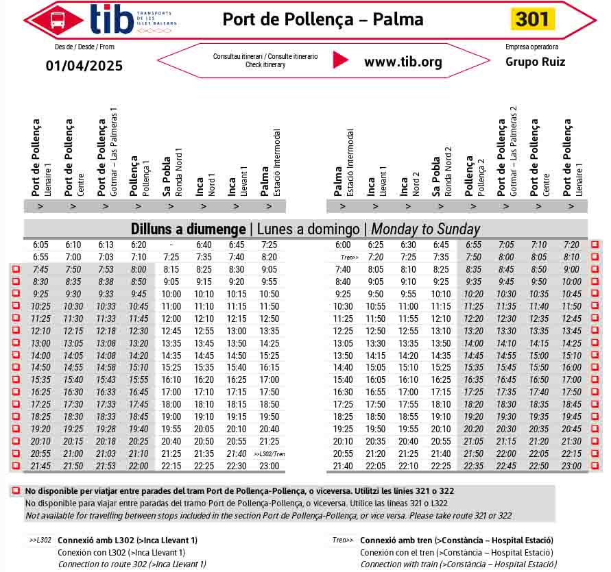 A partir de l’1 d’abril, la línia 301 del servei de bus interurbà TIB, que connecta el Port de Pollença amb Palma, augmentarà les seves freqüències per millorar la mobilitat dels residents i treballadors de la zona. Concretament, s’afegiran tres nous trajectes en sentit Palma i quatre en sentit Port de Pollença respecte a l’horari de l’any passat. Amb aquest reforç del servei, es busca facilitar els desplaçaments diaris, especialment a primera hora del matí i a darrera hora del vespre, franges en què es concentra un gran nombre d’usuaris que es desplacen per motius laborals o personals.