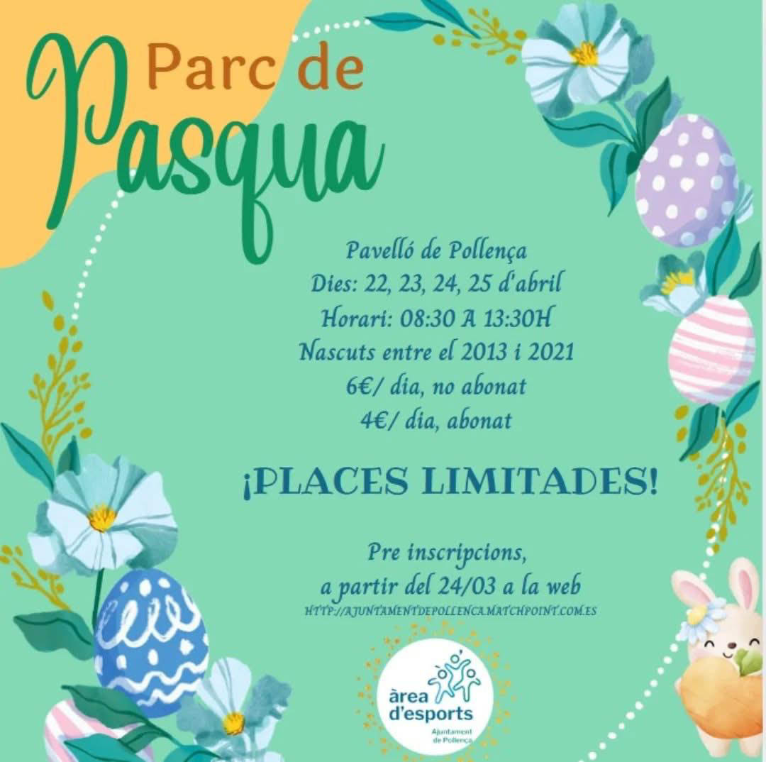 El Parc de Pasqua es durà a terme al pavelló del Poliesportiu de Pollença els dies 22, 23, 24 i 25 d’abril de 2025, en horari de 08:30 a 13:30 h. El preu de l’activitat és de 6 €/dia per a no abonats al poliesportiu i de 4 €/dia per a abonats.