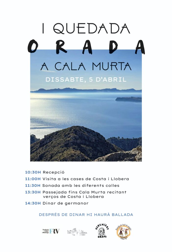 Després de la recepció, es farà una visita a les cases de Costa i Llobera i una sonada amb les diferents colles que participaran en aquesta Quedada Orada. A continuació, baixaran fins a Cala Murta tot recitant versos de Costa i Llobera. Després del dinar de germanor, hi haurà ballada.