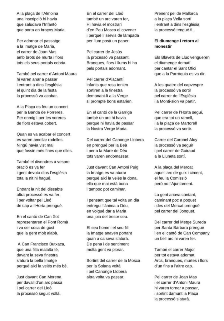 A les 21.00 h, PROCESSÓ DE LA SANG amb l’itinerari següent: església parroquial, Antoni Maura, plaça dels Seglars, Horta, Monti-Sion, Miquel Costa i Llobera, Sant Sebastià, Roca, Àguila, Mena, horta, Barques, bisbe Cànaves, Verger, Bartomeu Aloy, Pare Vives, Joan Binimelis, Adan Diehl, Sant Jordi, Metge Sureda, Jonquet, Mercat, plaça Major i església parroquial.