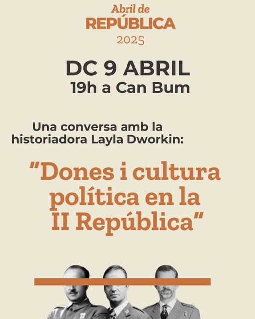A les 19 hores, a Can Bum i en el marc dels actes d’Abril de República, la historiadora pollencina Layla Dworkin conversarà sobre “Dones i cultura política en la II República”. Mesos enrere, Layla Dworkin va ser premiada amb un dels dos premis al millor treball de fi de màster de la UIB amb l’estudi “Ses Misteres. Dones, treball i cultura política a la perifèria industrial de Palma”.