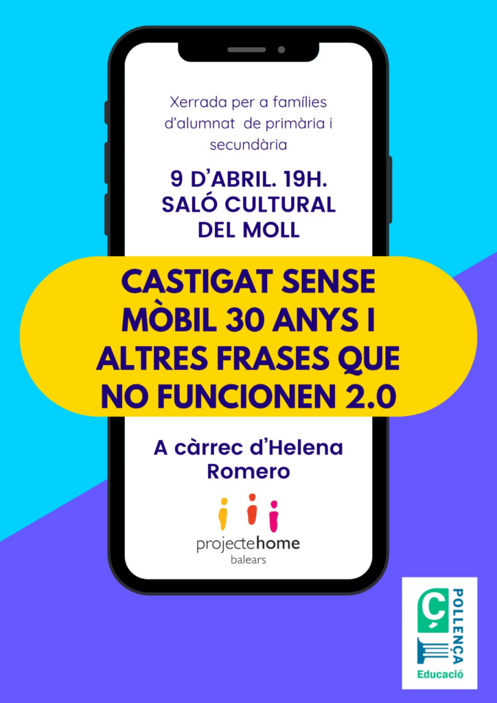 També a les 19 hores, però al Saló Cultural del Port de Pollença, els pares i mares d’alumnes de primària i secundària del municipi tenen l’oportunitat d’assistir a una xerrada d’Helena Romero que duu per títol “Castigat sense mòbil 30 anys i altres frases que no funcionen 2.0”.
