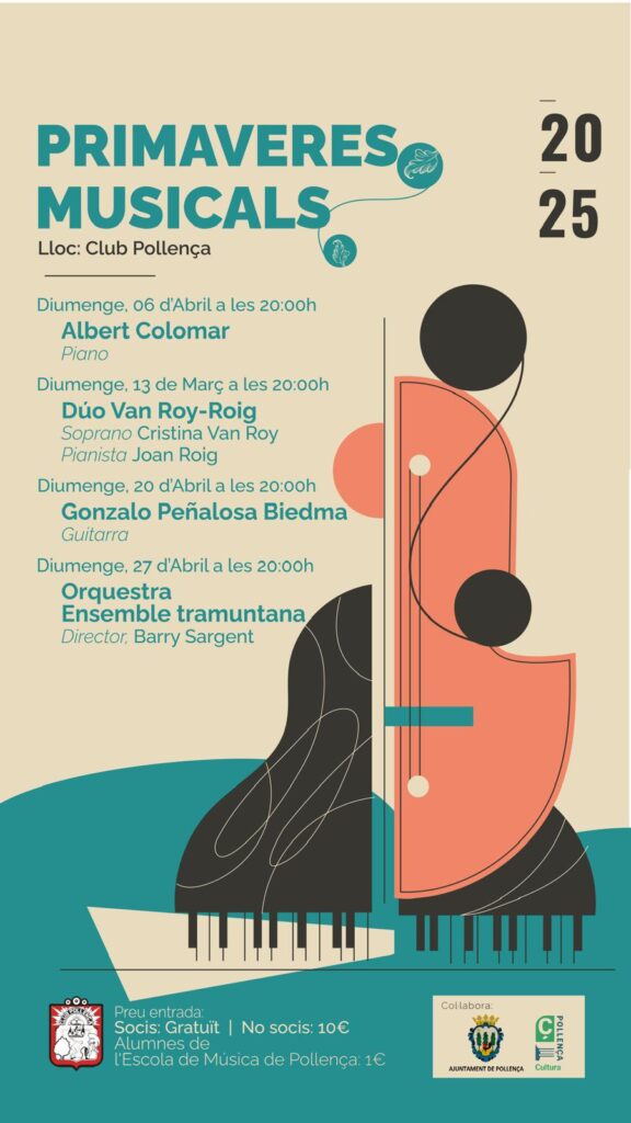 A les 20 hores, al Club Pollença, hi haurà el segon concert de les Primaveres Musicals que anirà a càrrec del Dúo Van Roy-Roig, un duet format per la soprano Cristina Van Roy i el pianista Joan Roig. Dedicat als lieder, el recital inclourà “una selecció dels lieder Op. 74 de Frederich Chopin, cantats en polonés; unes peces poc programades”, va avançar el coordinador de les Primaveres Musicals, Joan Campomar Cerdà.