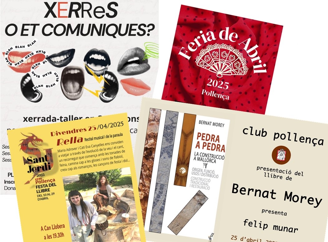Avui, divendres 25 d’abril, l’agenda sociocultural pollencina és d’allò ben atapeïda: l’activitat de Sant Jordi continua i s’inaugura la “Feria de Abril”, al Club Pollença es presenta un llibre i a Can Bum comença un taller d’habilitats comunicatives, i hi ha el sorteig de les Àguiles i Sant Joan Pelós de 2026.