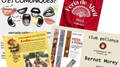 Tot això és el que podeu fer avui, divendres 25 d’abril, sense sortir de Pollença: taller d’habilitats comunicatives, elecció de les Àguiles i Sant Joan Pelós, recital de música popular amb Rella, inauguració de la “Feria de Abril” i presentació del llibre “Pedra a pedra” de Bernat Morey.