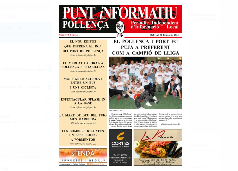 Al Punt informatiu Pollença número 710, corresponent a la segona quinzena de maig de 2025, es destaca que el Pollença i Port FC puja a Preferent com a campió de lliga. Per altra banda, també es destaca que el RCNPP estrena nou edifici, que el mercat laboral s’estabilitza a Pollença, que un ciclista mor en un greu accident de trànsit, que la Base acollí un espectacular Splash-IN, que la Mare de Déu del Puig és al Moll i que els Bombers de Mallorca rescataren un espeleòleg a Formentor.