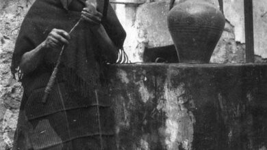 “Pollença, any 1921, una dona seu al costat d’un pou amb la filosa entre les mans”, així comença l’escrit de Joan Martorell sobre aquesta imatge.