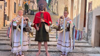 Després de tot un horabaixa de preparatius, les Julia, Montse i Joan han esdivingut Àguiles i Sant Joan Pelós, elements definitoris del Corpus pollencí.