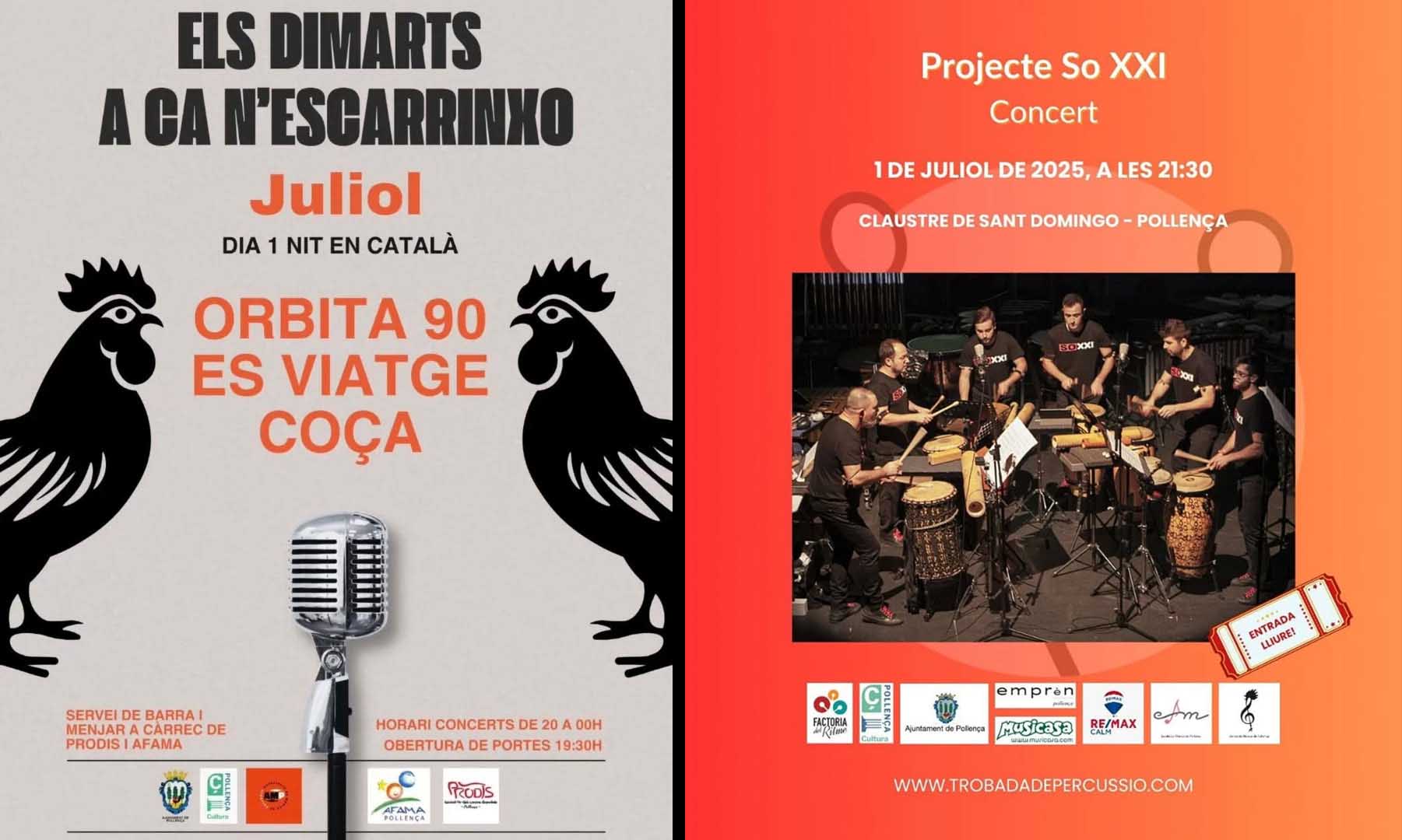 Mentrestant, a partir de les 20 hores, tornen els Dimarts a Ca n’Escarrintxo, que arranquen la seva programació estiuenca amb una Nit en català. Avui vespre hi actuaran els grups Òrbita90, Es Viatge i Coça, en una vetlada de música i festa amb servei de barres de menjar i beure a càrrec de les associacions Prodis i Afama. L’entrada és gratuïta.