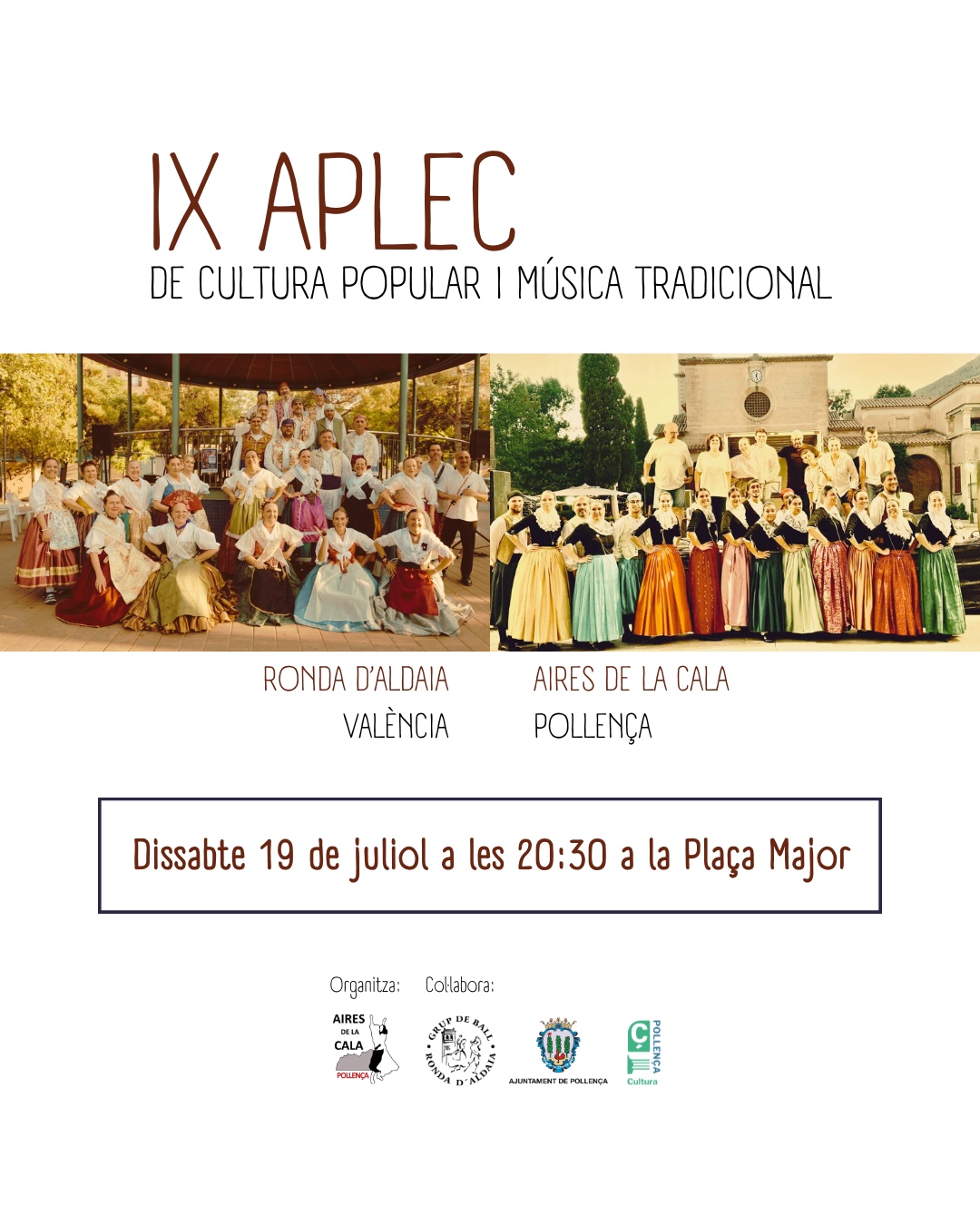 L’agrupació del País Valencià, Ronda d’Aldaia, participaran com a convidats al IX Aplec de Cultura Popular i Música Tradicional que organitza Aires de la Cala cada any per la Patrona. Concretament, aquest 2025, l’Aplec serà el dissabte 19 de juliol, a les 20’30 hores, a la plaça Major de Pollença.