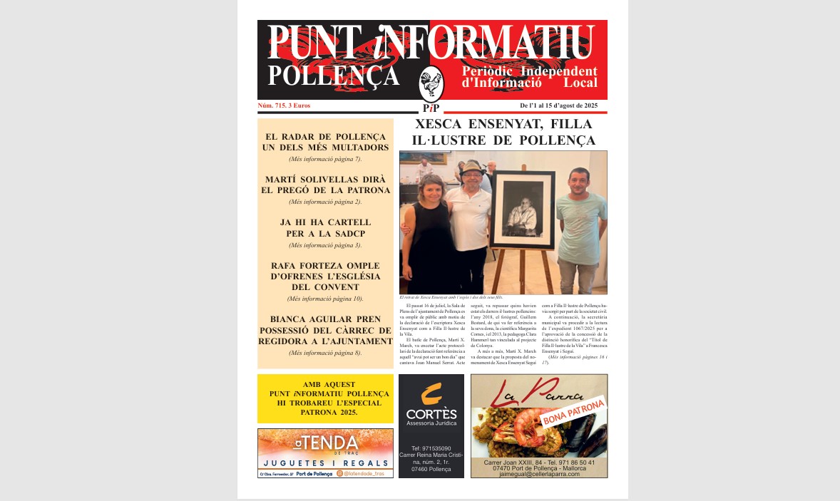 Al Punt informatiu Pollença número 715, corresponent a la primera quinzena del mes d’agots de 2025 i especial Patrona, es destaca en portada que “Xesca Emsenyat, Filla Il·lustre de Pollença”. A més a més, es fa referència a què el radar de Pollença és un dels més multadors, que Martí Solivellas dirà el pregó de la Patrona, que ja hi ha cartell per a la SADCP, que Rafa Forteza omple d’ofrenes l’Església del Convent i que Bianca Aguilar pren possessió del càrrec de regidora a l’Ajuntament.