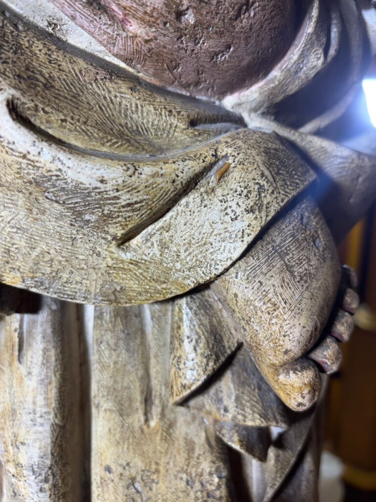 2. Dins el primer terç del s. XX es realitzà una neteja massa abrasiva que destruí la policromia de les carnacions i, per intentar arreglar-ho, aplicaren de forma basta algun producte que dissimulés el mal fet, fent especial incidència als llocs més afectats, com eren els rostres. En aquest moment es destruí la pàtina original de les carnadures.