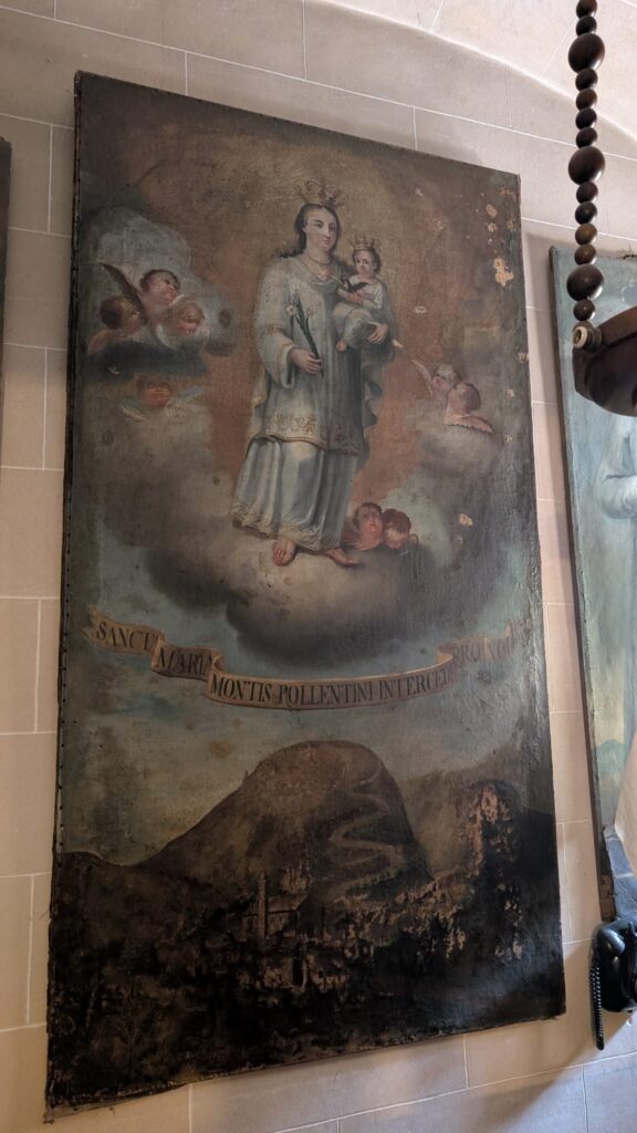 Pels mateixos dies, tinguérem coneixement d’una pintura de la Mare de Déu del Puig que es conserva a la parròquia de St. Jaume de Ciutat. La pintura és clarament del s. XIX i ens mostra la imatge amb un vestit blanc i una creu de Malta penjada al coll. Sembla ser coetània dels gravats que conservam del 1787 en la seva composició, tot i que més moderna en l’execució estilística.