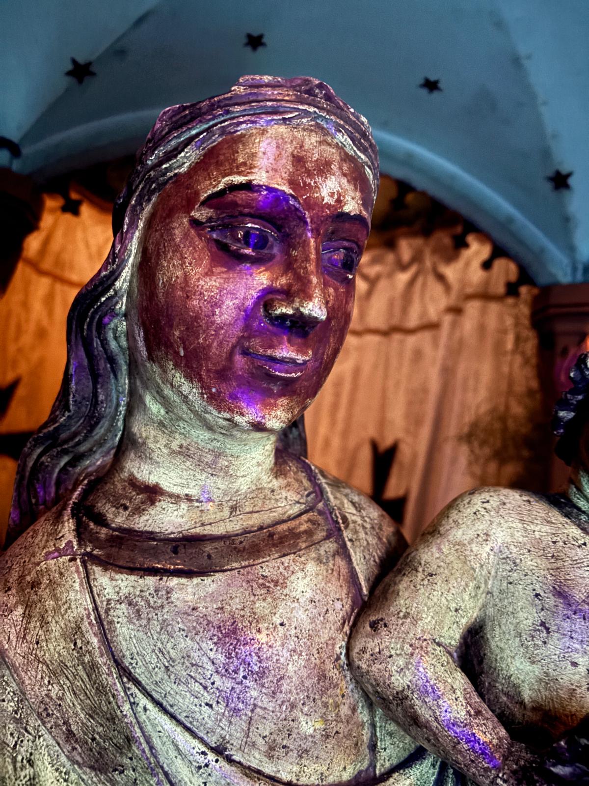 6. A part de la substància ennegridora, sols s’ha retirat la pintura del coll de la Mare de Déu per substituir-la per una aquarel·la més respectuosa amb la imatge.