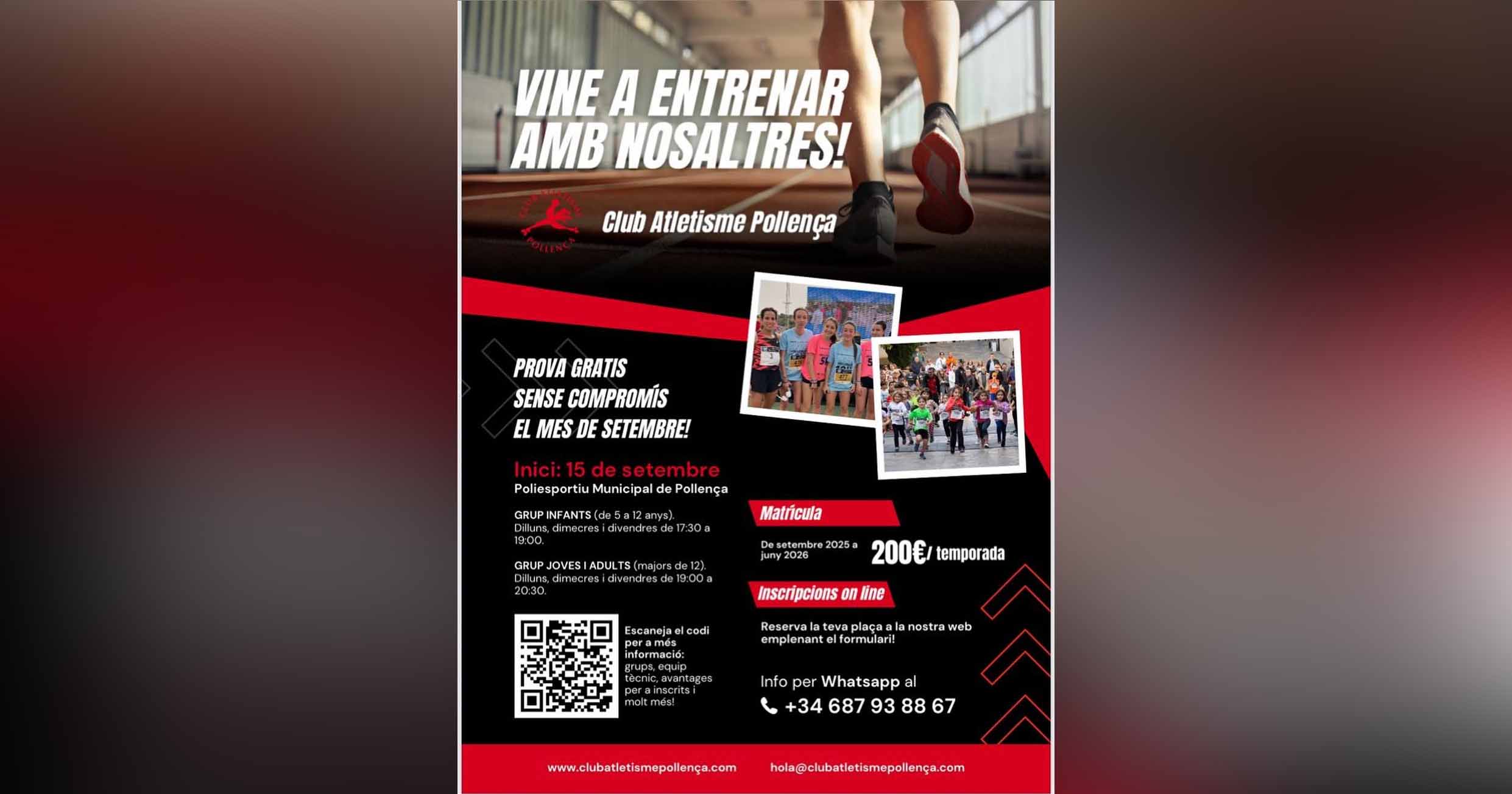 La matrícula ja és oberta i es pot fer fins al juny de 2026. El preu és de 200 euros per tota la temporada i inclou la fitxa federativa i l’assegurança. Per apuntar-se o demanar més informació, només cal acostar-se a la pista d’atletisme en horari d’entrenament o bé posar-se en contacte amb el club a través de la web www.clubatletismepollença.com, per WhatsApp al +34 687 93 88 67, o al correu electrònic hola@clubatletismepollença.com.