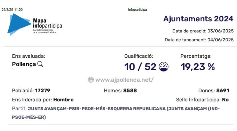 L’Ajuntament de Pollença torna a suspendre en transparència segons l’avaluació de la Universitat Autònoma de Barcelona. El consistori només compleix 10 dels 52 indicadors i no obté el segell Infoparticipa.
