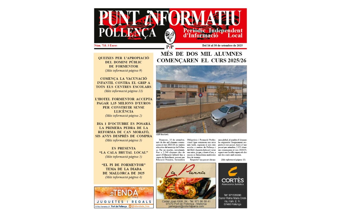 Al Punt informatiu Pollença número 718, corresponent a la segona quinzena del mes de setembre de 2025 es destaca en portada que “Més de dues mil palumnes començaren el curs 2025/26”. A més a més, també s’hi apunten les queixes per l’apropiació del domini públic de Formentor, que comença la vacunació infantil contra el grip a tots els centres escolars, que l’Hotel Formentor accepta pagar 1’15 milions d’euros per construir sense llicència, que dia 1 d’octubre es posarà la primera pedra de la reforma de can Morató, sis anys després de la compra, que es presenta “La Cala brutal local” i que “El Pi de Formentor” és tema de la Diada de Mallorca de 2025.
