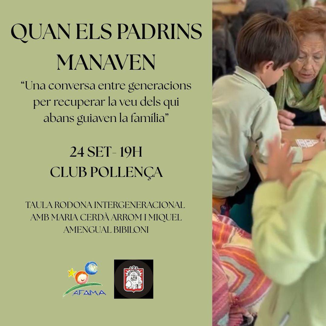 Amb el títol “Quan els padrins manaven”, demà, dimecres 24 de setembre, a les 19 hores, al Club Pollença, es durà a terme una taula rodona l’objectiu del qual és mantenir “una conversa entre generacions per recuperar la veu dels qui abans guiaven les famílies”.