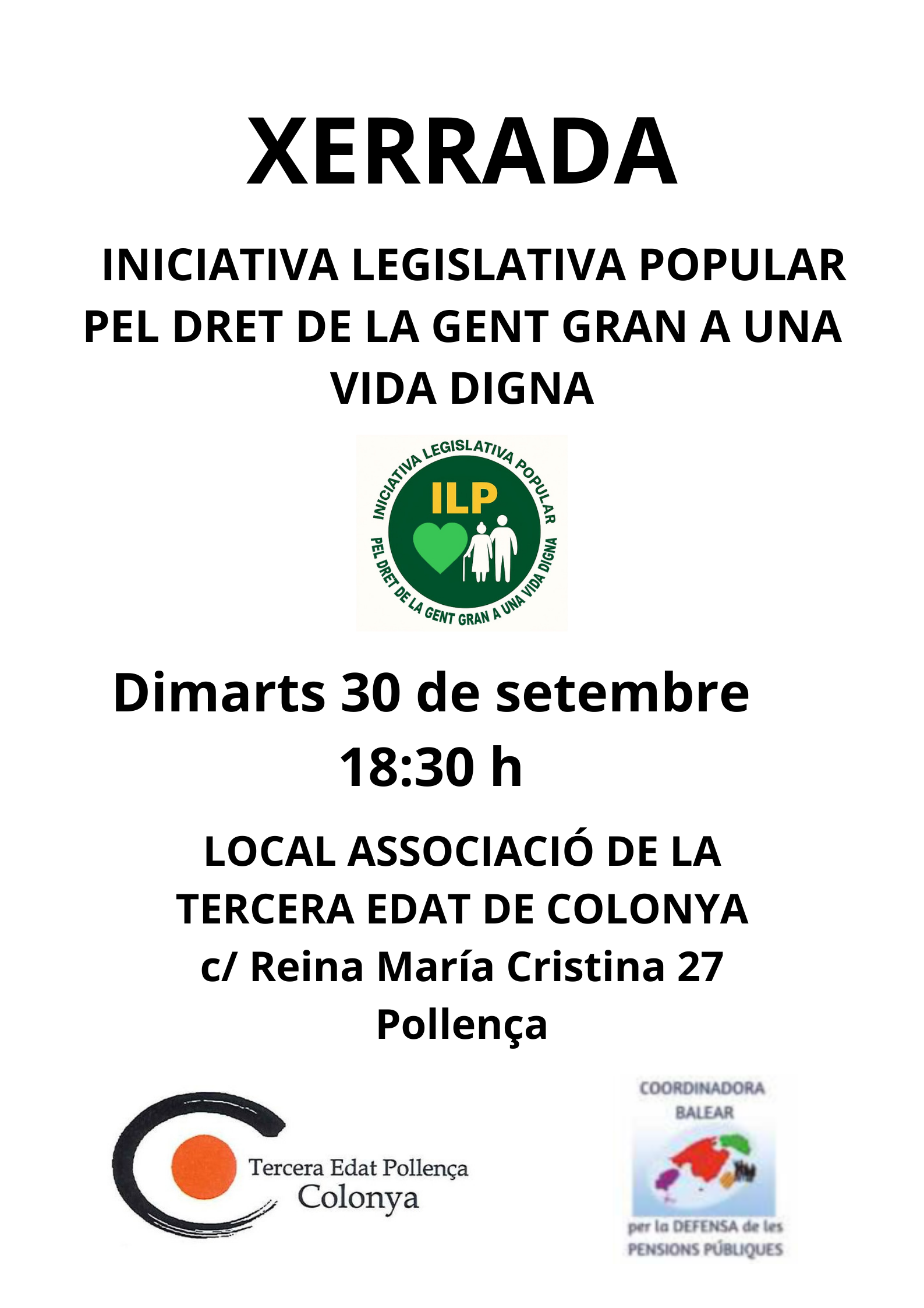 Si ets jubilat i tens pocs ingressos, t’interessa saber que aquest dimarts 30 de setembre, a les 18’30 hores, al Local Social de l’Associació de la Tercera Edat de Colonya, a Pollença, la Coordinadora Balear per la Defensa de les Pensions Públiques presentarà la Iniciativa Legislativa Popular per garantir que cap persona gran amb pocs ingressos quedi per sota del salari mínim interprofessional (SMI).