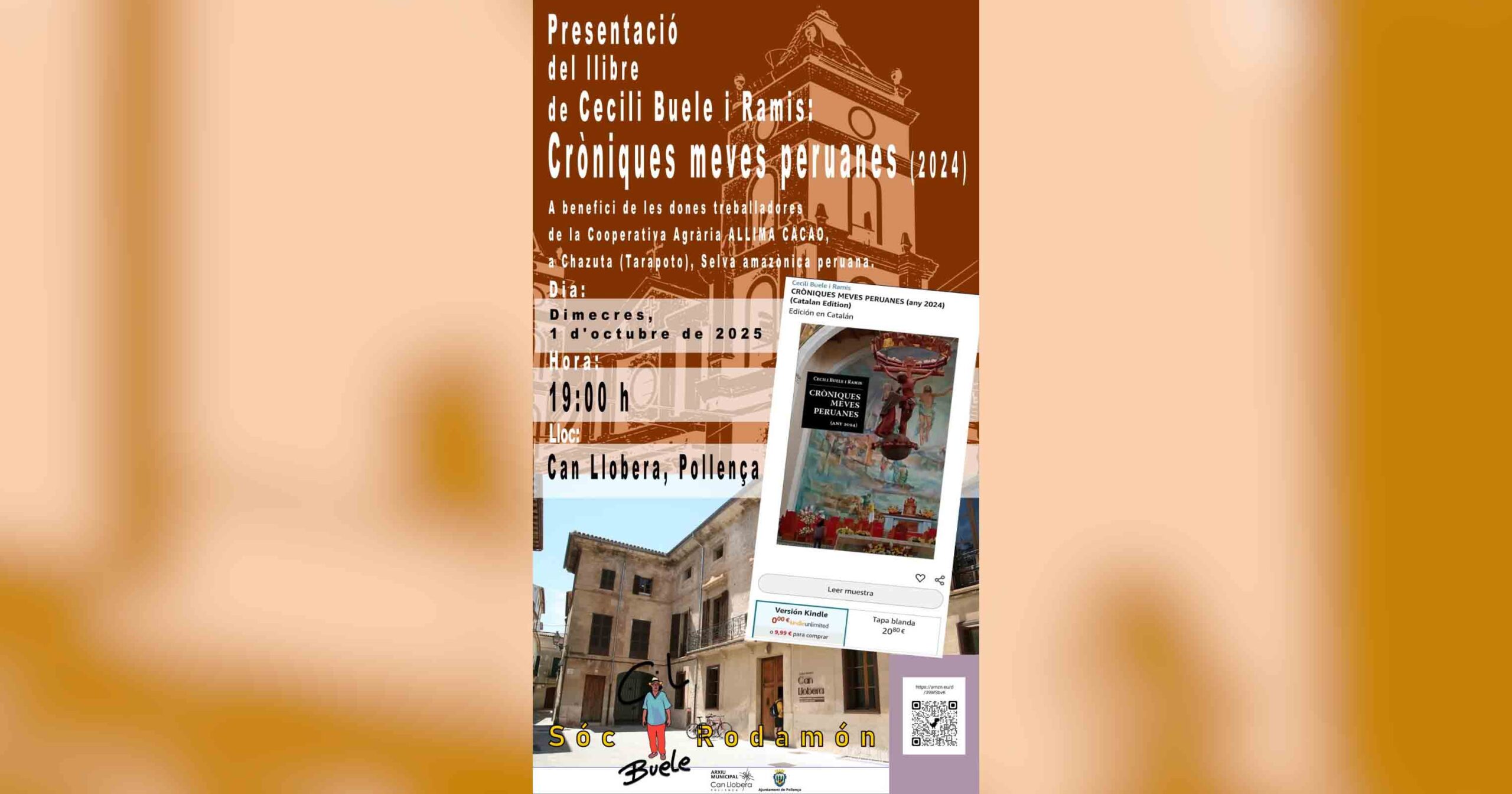 Aquest dimecres 1 d’octubre de 2025, a les 19 hores, a Can Llobera de Pollença, es presenta el llibre Cròniques meves peruanes (2024) de Cecili Buele. Es tracta d’una obra que recull les vivències del seu darrer viatge al Perú, on passà mig any recorrent la costa, la serra i la selva amazònica, amb un rerefons solidari en benefici de la Cooperativa Agrària AllimaCacao de Chazuta (Tarapoto).