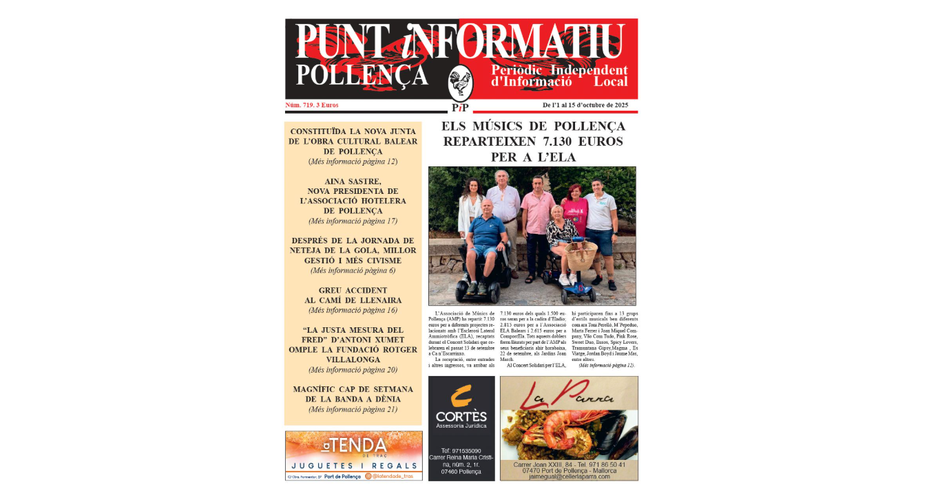 Al Punt informatiu Pollença número 719, corresponent a la primera quinzena del mes d’octubre de 2025 es destaca en portada que “Els músics de Pollença reparteixen 7.130 euros per l’ELA”. A més a més, també s’hi apunta que s’ha constituït la nova junta de l’Obra Cultural Balear a Pollença; que Aina Sastre és la nova presentada de l’Associació Hotelera de Pollença; que després de la jornada de neteja de la Gola es demanarà una millor gestió i més civisme; que hi va haver un greu accident al camí de Llenaira; que Antoni Xumet va presentar amb èxit el seu darrer poemari a la Fundació Rotger Villalonga i que la Banda de Música de Pollença va viure un magnífic cap de setmana a Dènia.