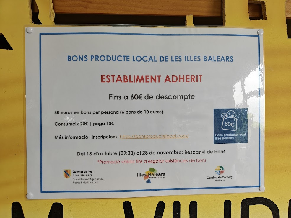 A partir de les 9.30 hores d’avui dematí, els consumidors poden adquirir producte local a meitat de preu gràcies a aquests bons, amb un descompte de 10 euros per cada 20 euros de compra, fins a un màxim de 60 euros per persona. A Pollença, hi participen tres productors: la Cooperativa Pagesa, Sobrassada Can Puig i vi Can Axartell, als quals també s’hi suma Oli Solivellas.