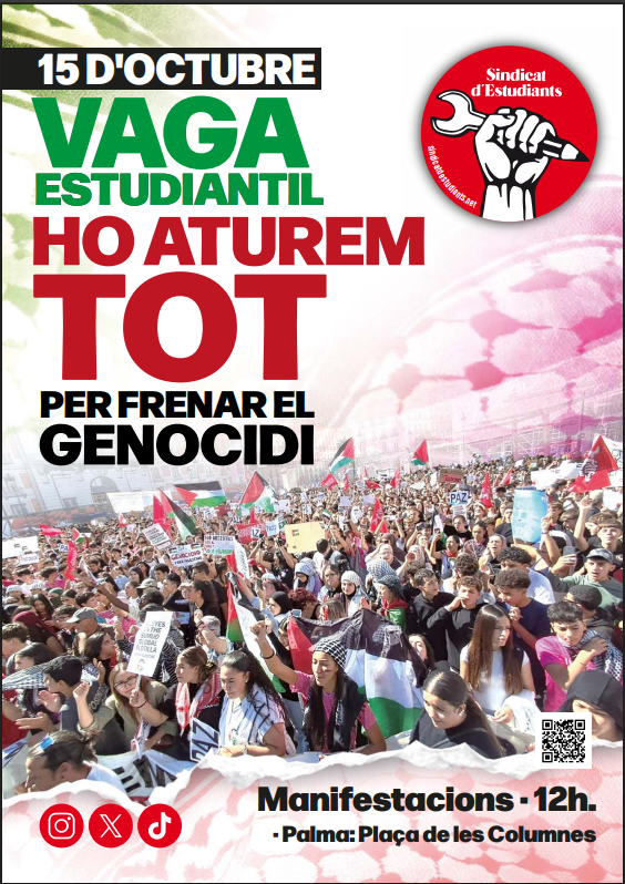 “Tot i l’anunci recent d’un acord de pau i d’un alto el foc provisional, la violència estructural, el desarrelament i l’espoli sobre el territori palestí continuen actius. No hi pot haver pau mentre es mantingui la colonització, el bloqueig i la impunitat“, apunten des del GOB, una de les entitats de les illes Balears que, demà 15 d’octubre, se sumen a la vaga general de demà, 15 d’octubre.