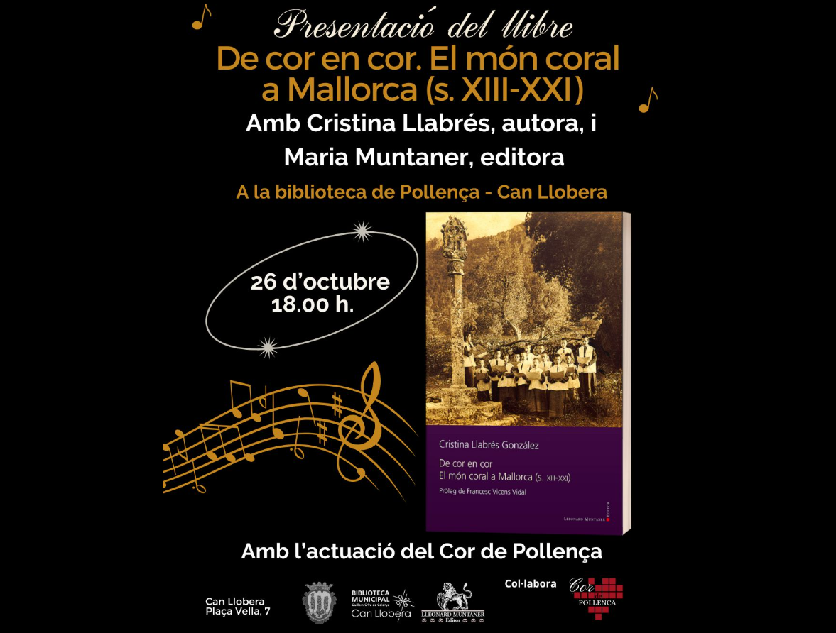 Avui diumenge, 26 d’octubre, a les 18 hores, a Can Llobera, hi haurà la presentació dle llibre De cor en cor. El món coral a Mallorca (s. XIII-XXI)“ de Cristina Llabrés (Lleonard Muntaner, 2025). A més de l’autora, participarà a l’acte l’editora Maria Muntaner i el Cor de Pollença que oferirà un recital.