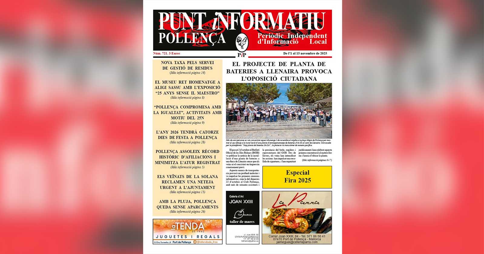 A la portada hi destaca la oposició al projecte de la planta de bateries del camí de Llenaira, així com informacions sobre la nova taxa de residus, l’exposició homenatge a Aligi Sassu al Museu de Pollença, les activitats previstes pel 25N, l’augment històric de les afiliacions laborals al municipi o les queixes veïnals per la vegetació i la brutor a la solana.