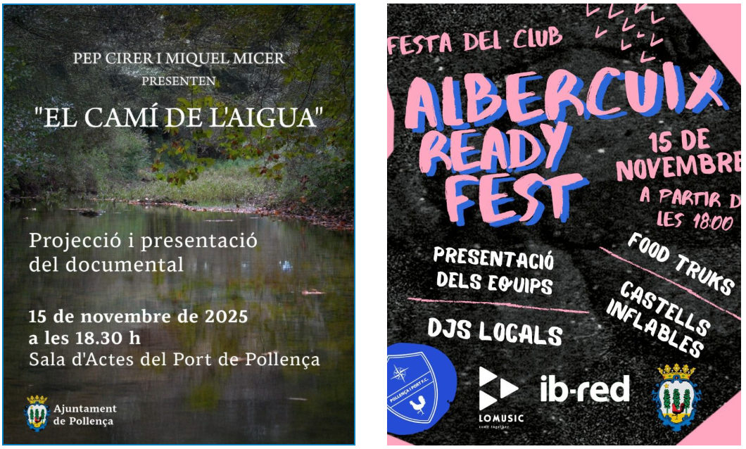 Avui, dissabte 15 de novembre, l’activitat sociocultural al municipi de Pollença es concentra al Moll, on hi haurà l’Albercuix Ready Fest del Pollença i Port FC, però també la projecció del documental “El cicle de l’aigua” de Pep Cirer i Miquel Micer.