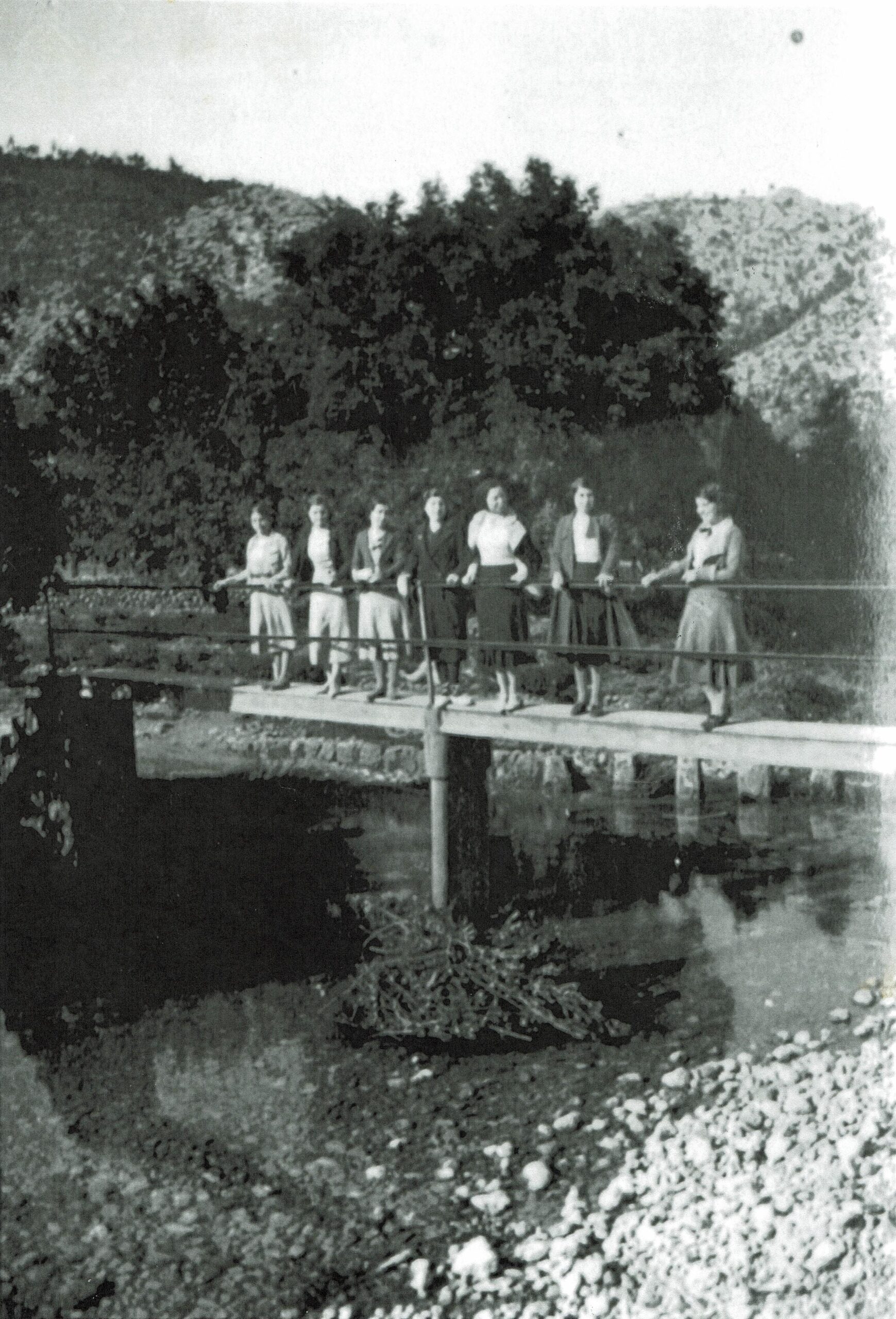 Aquesta fotografia, ens explica Antònia Ventayol, és d’abans dels anys quaranta i una de les al·lotes que hi apareixen, dreta sobre el pont del Pas d’en Barqueta, és sa mare, tot i que no pot posar nom a la resta. Segurament aquell dia havien sortit de passeig o d’excursió, ja que el pont queda a poc més d’un quilòmetre del poble, al camí de Lluc -que aleshores probablement encara no era camí vell, sinó simplement “camí o carretera de Lluc”-, avui part de la Ruta de Pedra en Sec (GR-221).