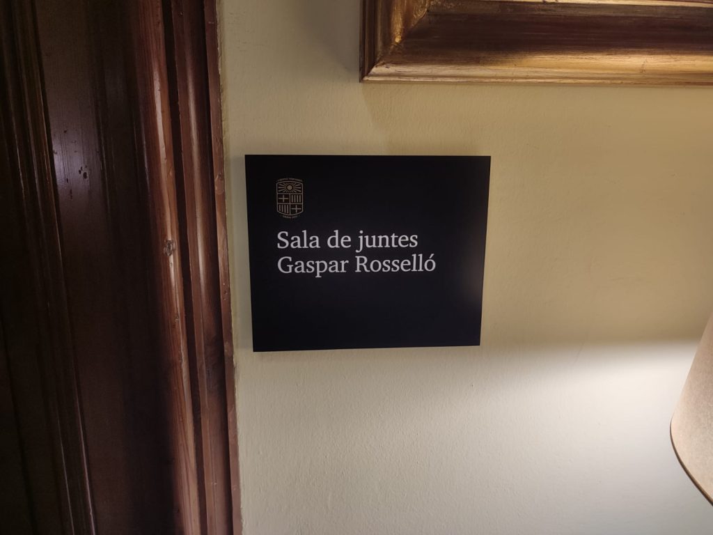 Això és el canvi de nom de la Sala de Juntes del Rectorat, que a partir d’ara es diu Sala de Juntes Gaspar Rosselló en reconeixement i memòria de qui tant va fer per a la Universitat de Barcelona.