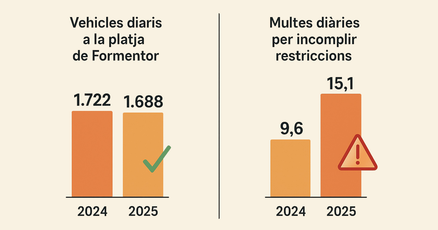 Aquest any s’han tramitat 2.314 expedients sancionadors, amb una mitjana de 15,12 multes diàries, molt superior a les 1.175 sancions del 2024 (mitjana de 9,6 diàries). La majoria d’infraccions, 2.285 casos, corresponen a l’accés sense autorització a la zona del faro de Formentor, mentre que només 29 sancions afecten l’accés a la platja, que estava condicionat a la disponibilitat de places d’aparcament controlades per l’Ajuntament i indicades mitjançant un panell informatiu a la rotonda del Moll.