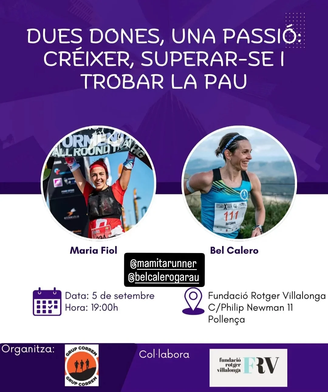 Demà, divendres 5 de setembre, a les 19 hores, la Fundació Rotger Villalonga (carrer Philip Newman, 11, de Pollença) acollirà la conferència “Dues dones, una passió: créixer, superar-se i trobar la pau”. L’acte, organitzat pel grup Correm, és obert a tothom i vol posar de manifest tant la dimensió esportiva com la terapèutica del trail running.
