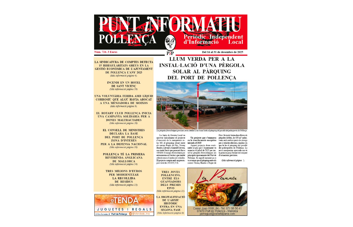 Al Punt informatiu 724, corresponent a la segona quinzena de 2025, es destaca que s’ha donat llum verda per a la instal·lació d’una pèrgola solar al pàrquing del Port de Pollença. A més a més, també s’apunta que la sindicatura de comptes detecta 15 irregularitats greus de l’ajuntament de Pollença l’any 2023, hi va haver un incendi en un hotel de Sant Vicenç, que una voluntària resultà ferida amb el líquid corrosiu que algú havia abocat en una menjadora de moixos, que el Rotary Club Pollença inicia una campaya solidària per a dones maltractades, que el Consell de Ministres delcara la Base del Port de Pollença zona d’interès per a la defensa nacional, que Pollença té la primera reverenda anglicana de Mallroca i que es destinen tres milions d’euros per modernitzar la recollida de residus.