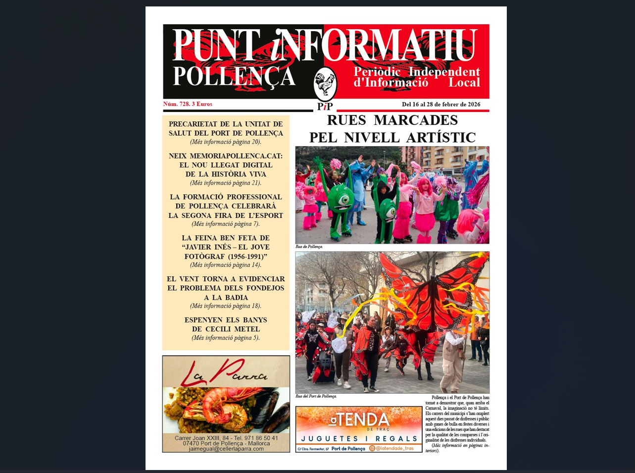 Des d’ahir dimecres 18 de febrer, el Punt Informatiu és als quioscs amb la informació generalista al municipi de Pollença corresponent a la segona quinzena de febrer de 2026.