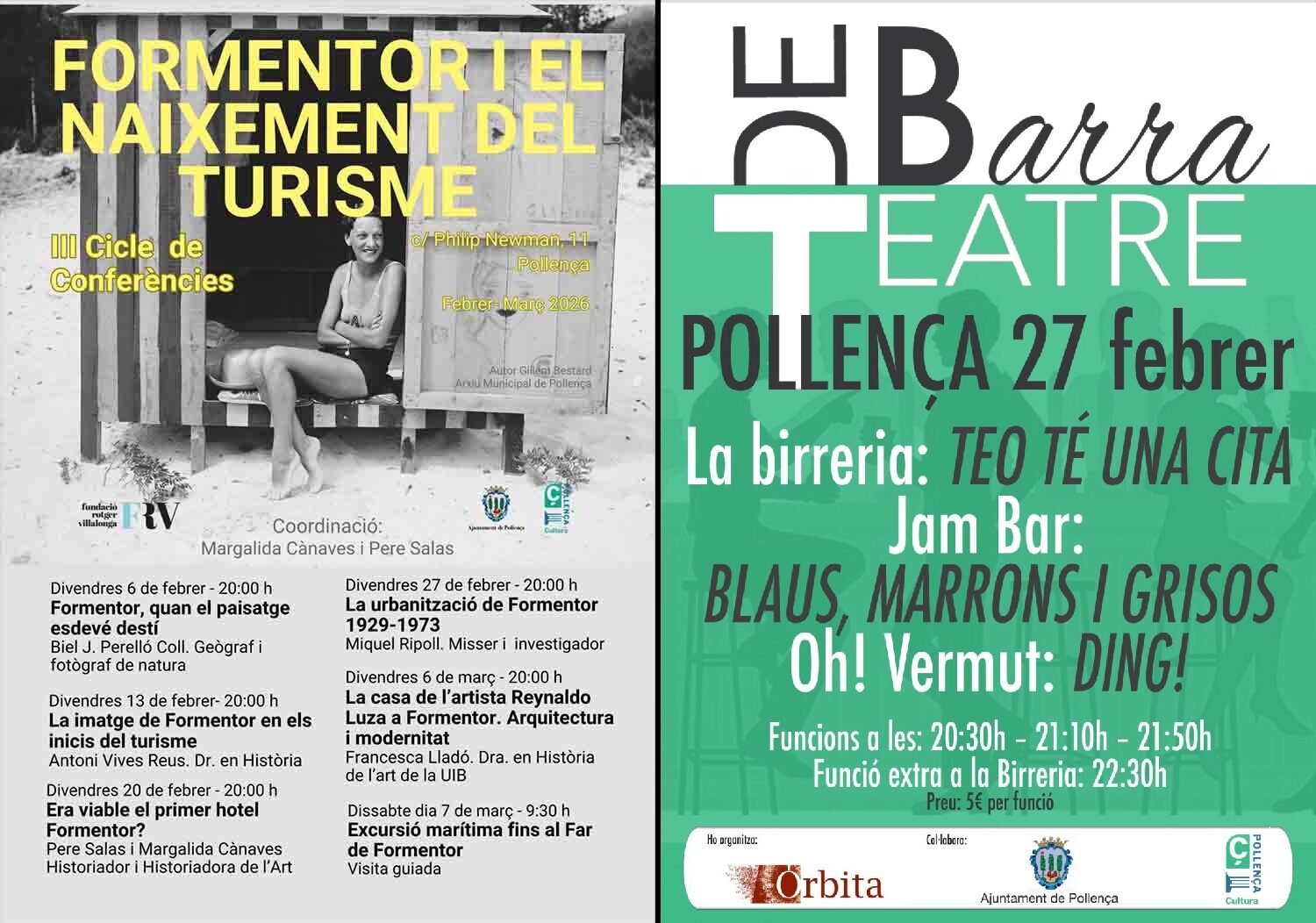 Avui, divendres 27 de febrer, el municipi ofereix una doble cita: una conferència sobre el passat turístic de Formentor i una nova edició de Teatre de Barra.